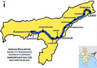 Guwahati–Ledo Intercity Express is an intercity train of the Indian Railways connecting Guwahati in Guwahati and Ledo on eastern end of Assam. It is currently being operated with 15603/15604 train numbers on a daily basis.[1][2][3]