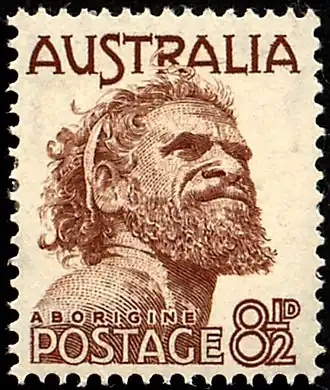 In 1950 the image was used on an 8½ pence stamp and a 2 shillings and 6 pence (half crown) stamp,[13][1] which made Tjungurrayi the first Aboriginal person, as well as the first living Australian, to appear on an Australian postage stamp.[3] The stamp was re-released in 1952,[5] and over 99 million of the stamps were sold between 1950 and 1966.[3] However, in 2021 it was discovered that his image was reproduced on an even earlier stamp – a stamp released in 1938 to celebrate the centenary of Geelong. This stamp was only a collector's item and there was no decimal mark printed on it.[1]