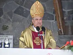 György Miklós Jakubinyi (born 13 February 1946) is a Romanian cleric, the former archbishop of the Roman Catholic Archdiocese of Alba Iulia. Born into an ethnic Hungarian family in Sighetu Marmației, he attended school in his native town from 1952 to 1963 before beginning his religious training that year at the Roman Catholic Theological Institute of Alba Iulia. Ordained a priest in 1969 by Áron Márton, he was consecrated auxiliary bishop at Șumuleu Ciuc in 1990. The following year, he became administrator of the Ordinariate for Catholics of Armenian Rite in Romania. He was made archbishop in 1994,[1] and retired in 2019.[2]
