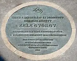 Upon his death on 31 July 1937, Zala was given a state funeral and buried at Kerepesi Cemetery, with a tombstone made by Miklós Ligeti.[2] The Hungarian National Gallery today is in possession of some 30 of Zala's works.[3] A commemorative plaque to Zala is embedded in the pavement outside his former villa in Budapest.