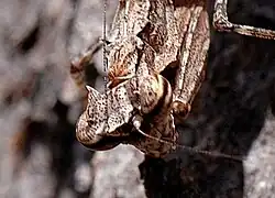 Spiny bark mantis showing two spines just behind the eyes