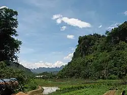 The topography of the province of Hà Giang is fairly complex: "temperate, but highly localized montane weather patterns create variable conditions among different regions".[13] It has impressive limestone and granite peaks and outcrops. It has three regions. Climatically, it has two seasons, dry and monsoon, dependent on the altitude of the region. The two northern Indochinese climatic zones on the border influence the climate in the northern part of the province. The lower areas in the province comprise low hills, the Lô River Valley and Hà Giang city.[8][13] In Cao Bồ district, the dry season lasts from mid-September until the end of May, and the monsoon season lasts from the beginning of June until mid-September. However, in Du Già district the wet season sets in one month earlier. The average annual temperature in the provincial capital of Hà Giang is 22.78 °C (73.00 °F); the monthly averages range from a low of 15.48 °C (59.86 °F) in January to a high of 27.88 °C (82.18 °F) in July. The annual rainfall in Hà Giang city is 2,430.1 millimetres (95.67 in); the monthly average varies from a low of 31.5 millimetres (1.24 in) in December to a high of 515.6 millimetres (20.30 in) in July. The average annual humidity level is 84%.[13]