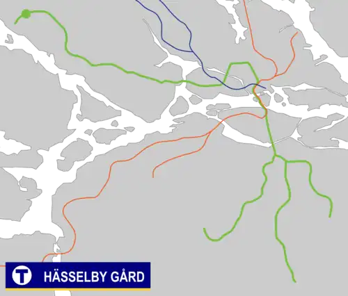 Hässelby gård metro station is a station on the Green line of the Stockholm metro. It is located in the district of Hässelby gård, which is part of the borough of Hässelby-Vällingby in the west of the city of Stockholm. The station is elevated and has a single island platform, with access from a lower level station building on Hässelby torg.[3] The distance to Slussen is 17.7 km (11.0 mi).[1][4]
