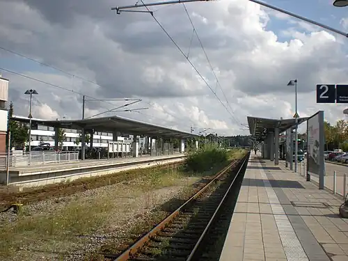 Höhenkirchen-Siegertsbrunn is a station on the Munich S-Bahn network on the Munich-Giesing–Kreuzstraße railway. It is located in the community of Höhenkirchen-Siegertsbrunn, south-east of Munich. It has two side-platforms with a large distance between the tracks. It is served by line S7 in a twenty-minute rhythm. A third of the outbound trains terminate here, the rest continues further to Aying or Kreuzstraße. Before 2005 the station had one island-platform, which was demolished after the opening of the two side-platforms in 2005. The station is staffed: tickets can be purchased at the DB store. The station facilities are: toilets, a bus stop, bicycle stands and P+R (park and ride).[4] The station is located at the ground level so it is accessible by wheelchair. The north half of both platforms is covered by a roof. The travel time to Marienplatz is approximately 30 minutes.
