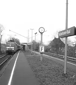 Hückelhoven-Baal station is in the Hückelhoven district of Baal in the German state of North Rhine-Westphalia on the Aachen–Mönchengladbach railway. It is classified by Deutsche Bahn as a category 5 station.[1] With its construction as an interchange station on two levels, it became important as a hub for passenger services, but in recent years it has lost this significance due to the closure of the adjacent section of the Jülich–Dalheim railway. Meanwhile, the passenger station has been reclassified as a halt and it was renamed as Hückelhoven-Baal in 2002. Baal freight yard still exists.