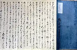 Unusually for works of the period, Chōmei's original manuscript survives. Numerous copies have been made and circulated, some complete and some abridged. The complete editions are further categorized into old and popular, while the abridged editions are categorized into Chōkyō, Entoku, and Mana. The Chōkyō and Entoku editions are named after the era date in the afterword and both include extra passages. The Mana editions are written entirely in kanji replacing the kana in the kohon editions.[21]