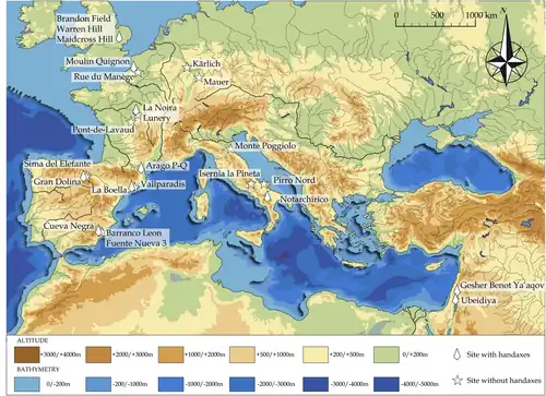 38. ^ Moncel, M.-H.; Santagata, C.; Pereira, A.; Nomade, S.; Voinchet, P.; Bahain, J.-J.; Daujeard, C.; Curci, A.; Lemorini, C.; Hardy, B.; Eramo, G.; Berto, C.; Raynal, J.-P.; Arzarello, M.; Mecozzi, B.; Iannucci, A.; Sardella, R.; Allegretta, I.; Delluniversità, E.; Terzano, R.; Dugas, P.; Jouanic, G.; Queffelec, A.; d'Andrea, A.; Valentini, R.; Minucci, E.; Carpentiero, L.; Piperno, M. (2020). "The origin of early Acheulean expansion in Europe 700 ka ago: new findings at Notarchirico (Italy)". Scientific Reports. 10 (1): 13802. Bibcode:2020NatSR..1013802M. doi:10.1038/s41598-020-68617-8. PMC 7429832. PMID 32796860.