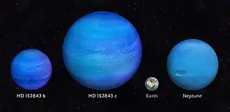 HD 152843 c is the second planet in the star system and farthest planet from its star. It has 9.7 Earth masses and 5.9 Earth radii. It orbits its host star at a speed of 7.1 kilometers a second, with its orbital eccentricity being 0.07 and an orbital inclination of 89.2°.[8] Its low density of 0.253+0.059