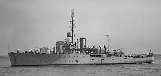 In 1938, the Australian Commonwealth Naval Board (ACNB) identified the need for a general purpose 'local defence vessel' capable of both anti-submarine and mine-warfare duties, while easy to construct and operate.[2][3] The vessel was initially envisaged as having a displacement of approximately 500 tons, a speed of at least 10 knots (19 km/h; 12 mph), and a range of 2,000 nautical miles (3,700 km; 2,300 mi)[4] The opportunity to build a prototype in the place of a cancelled Bar-class boom defence vessel saw the proposed design increased to a 680-ton vessel, with a 15.5 knots (28.7 km/h; 17.8 mph) top speed, and a range of 2,850 nautical miles (5,280 km; 3,280 mi), armed with a 4-inch gun, equipped with asdic, and able to fitted with either depth charges or minesweeping equipment depending on the planned operations: although closer in size to a sloop than a local defence vessel, the resulting increased capabilities were accepted due to advantages over British-designed mine warfare and anti-submarine vessels.[2][5] Construction of the prototype HMAS Kangaroo did not go ahead, but the plans were retained.[6] The need for locally built 'all-rounder' vessels at the start of World War II saw the "Australian Minesweepers" (designated as such to hide their anti-submarine capability, but popularly referred to as "corvettes") approved in September 1939, with 60 constructed during the course of the war: 36 (including Gladstone) ordered by the RAN, 20 ordered by the British Admiralty but manned and commissioned as RAN vessels, and 4 for the Royal Indian Navy.[2][7][8][9][1]