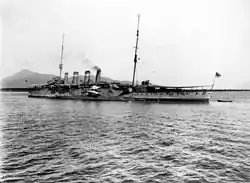The cruiser's main armament was made up of eight single BL 6-inch Mark XI guns.[2][3] Secondary and anti-aircraft armament consisted of a single 3 inches (76 mm) quick-firing high-angle anti-aircraft gun and ten 0.303-inch machine guns (eight Lewis guns and two Maxim guns).[2] Two 21-inch torpedo tubes were fitted, with a payload of seven torpedoes carried.[2] Two hydraulic-release depth charge chutes were carried for anti-submarine warfare.[2] A single 12-pounder 8-cwt field gun and four 3-pounder Hotchkiss saluting guns rounded out the armament.[2] Armour plating consisted of side belts 3-inch (76 mm) thick amidships, tapering to 1.5-inch (38 mm) thick at the bow and stern, along with protective decking over the engineering and magazine spaces, and an armoured conning tower.[4]