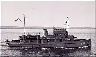 Ambler was requisitioned in May 1940 and commissioned on 6 May 1940 at Midland, initially carrying the pennant number Q11 and later Z32.[1][2] The vessel was sent to Quebec City where she was the second ship to be converted to an armed yacht and had her armament installed.[1][5] Ambler's initial posting was as a patrol ship in the Gulf of St. Lawrence and St. Lawrence River. She remained there until October 1941 when the ship was transferred to Halifax and used as a tender ship to HMCS Stadacona. In 1942 she was transferred to HMCS Cornwallis as a training ship and remained there for the rest of the war. Ambler was paid off on 20 July 1945 and placed in reserve at Sydney, Nova Scotia.[1] The vessel was put up for disposal on 31 January 1946, and in 1947 Ambler was sold to Greek interests.[1][6]