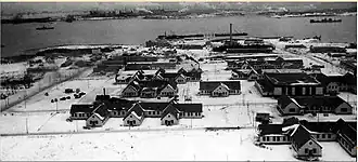 HMCS Protector was initially stationed on the Sydney waterfront and used commercial wharves and buildings along Esplanade Street, where the present armouries and marine terminal are located.[5] On 15 March 1943, a new custom-built shore facility and extensive piers was opened at Point Edward on the opposite western shore of the harbour, and was named HMCS Protector II, while the original was then renamed HMCS Protector I.[6] A Canadian National Railways line linked this new base to the mainline to Point Tupper.[7] Numerous convoy supply ships and warships were loaded and serviced at Protector by ship chandlers such as Sydney Ship Supply;[8] at the same time, the navy maintained use of the commercial facilities on the eastern shore in Sydney proper.[5] The base specialised in repair and fitting.