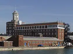 Several of Portsmouth Dockyard's most notable historic buildings date from this period, with several older wooden structures being replaced in brick on a larger scale. The three great storehouses (Nos 9, 10 & 11)[50][51][52] were built between 1764 and 1785 on a wharf, alongside a deep canal (or camber) which allowed transport and merchant vessels to moor and load or unload goods; the camber was rebuilt in Portland stone between 1773 and 1785.[39] On the other side of the camber, on newly reclaimed land, two more sizeable brick storehouses were built to serve as a sail loft and a rigging store; the reclaimed land was later named Watering Island after a fresh water supply was provided for ships mooring alongside.[3]
