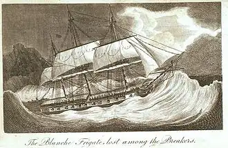 On 4 March 1807, Blanche was wrecked whilst cruising off Ushant. Forty-five of her crew were lost, of whom 20 were Royal Marines. All of the officers were saved, as were 180 seamen and 25 marines. The French marched the survivors 30 miles (48 km) to Brest, where they were housed in the naval hospital.[2] The crew would remain prisoners for seven years until Napoleon's abdication. The court martial on 2 June 1814 honourably acquitted Lavie and his officers of the loss of Blanche. The court found that iron stanchions, cranks, and arms under the half-deck had affected her compasses. This in turn had caused her navigation to be faulty.[3]