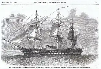 Conqueror was initially commanded by Thomas Matthew Charles Symonds and formed part of the Channel Squadron.[2] She was later assigned to operate in the Mediterranean during the Crimean War, and later was based out of Malta, when Hastings Yelverton took command on 22 July 1859. Yelverton was succeeded by William John Cavendish Clifford, and he by James Willcox in 1860, by which time Conqueror had returned to Plymouth.[2] Edward Southwell Sotheby took over command and was despatched to carry troops supporting the French intervention in Mexico in late 1861. While sailing through the Bahamas, Conqueror was wrecked on Rum Cay on 29 December 1861 due to a navigation error.[1] All 1,400 aboard were saved.