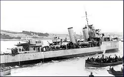 When World War II began on 3 September, Fraser was transiting the Panama Canal and arrived at Halifax on 15 September. She and her sisters were employed as local escorts to ocean convoys sailing from Halifax. In November the Royal Navy's North America and West Indies Station took operational control of the Canadian destroyers.[6] The ship escorted the convoy bringing most of the 1st Canadian Infantry Division to Britain part way across the North Atlantic in mid-December.[7] In March 1940 she was ordered to join the Jamaica Force for Caribbean patrols[6] before being reassigned to Western Approaches Command two months later.[1] On 26 May she left Bermuda for Britain and arrived at Plymouth on 3 June where she was pressed into service evacuating Allied troops from various French ports on the Atlantic coast.[6] Sometime in 1940, the ship's aft set of torpedo tubes was removed and replaced by a 4-inch (102 mm) AA gun.[1]