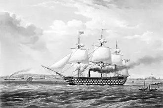 HMS Duke of Wellington was a 131-gun first-rate ship of the line of the Royal Navy. Launched in 1852, she was symptomatic of an era of rapid technological change in the navy, being powered both by sail and steam. An early steam-powered ship, she was still fitted with towering masts and trim square-set yards, and was the flagship of Sir Charles Napier.