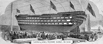 First christened HMS Windsor Castle, she was the first of a class of four that represented the ultimate development of the wooden three-decker ship of the line which had been the mainstay capital ship in naval warfare for 200 years. She was originally ordered in 1841 to a design of Sir William Symonds, the Surveyor of the Navy, but was not laid down until May 1849 at Pembroke Dock by which time Symonds had resigned and the design had been modified by the Assistant Surveyor John Edye. At this stage the ship was still intended as a sailing vessel. Although the Royal Navy had been using steam power in smaller ships for three decades, it had not been adopted for ships of the line, partly because the enormous paddle-boxes required would have meant a severe reduction in the number of guns carried. This problem was solved by the adoption of the screw propeller in the 1840s. Under a crash programme announced in December 1851 to provide the navy with a steam-driven battlefleet, the design was further modified by the new Surveyor, Captain Baldwin Walker. The ship was cut apart in two places on the stocks in January 1852, lengthened by 30 feet (9.1 m) overall and given screw propulsion. She received the 780 hp engines designed and built by Robert Napier and Sons for the iron frigate Simoon, which had surrendered them on conversion to a troopship. The ship was launched on 14 September 1852. On that day the Duke of Wellington died, and she was subsequently re-named in his honour and provided with a new figurehead in the image of the duke.