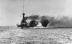 Between 17 and 20 July 1914, Hercules took part in a test mobilisation and fleet review as part of the British response to the July Crisis. Arriving in Portland on 25 July, she was ordered to proceed with the rest of the Home Fleet to Scapa Flow four days later[13] to safeguard the fleet from a possible surprise attack by the Imperial German Navy.[14] In August 1914, following the outbreak of World War I, the Home Fleet was reorganised as the Grand Fleet, and placed under the command of Jellicoe.[15] Most of it was briefly based (22 October to 3 November) at Lough Swilly, Ireland, while the defences at Scapa were strengthened. On the evening of 22 November 1914, the Grand Fleet conducted a fruitless sweep in the southern half of the North Sea; Hercules stood with the main body in support of Vice-Admiral David Beatty's 1st Battlecruiser Squadron. The fleet was back in port in Scapa Flow by 27 November.[16] The 1st Battle Squadron cruised north-west of the Shetland Islands and conducted gunnery practice on 8–12 December. Four days later, the Grand Fleet sortied during the German raid on Scarborough, Hartlepool and Whitby, but failed to make contact with the High Seas Fleet. Hercules and the rest of the Grand Fleet conducted another sweep of the North Sea on 25–27 December.[17]