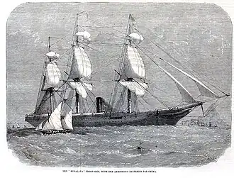 After purchase, Himalaya was converted to carry up to 3,000 soldiers and subsequently served as a troopship for four decades.[12][2] The purchase was initially viewed with suspicion by some naval experts; in the light of high losses of iron-hulled transports taken up from trade, General Howard Douglas concluded that ships such as Himalaya would prove unsatisfactory, particularly due to their vulnerability to gunfire.[13] Nevertheless, Himalaya served as a troopship for four decades.[12] During this time she supported operations during the Second Opium War, and carried troops to India, South Africa, the Gold Coast, and North America. In July 1857, she ran aground in the Strait of Banca. She was refloated on 8 July with assistance from the British merchant ship Gauntlet.[14][15] On 8 October 1859, Himalaya discovered the British barque Norma in a sinking condition, having been struck by a gale two days before. Norma was taken in tow, the pair reaching Bermuda on 12 October.[16][17] In 1863 the troopship was re-engined at the Keyham Steam Yard with a new two-cylinder horizontal single expansion engine, of 2,609 ihp.[18] In January 1870, Himalaya rescued the crew of the British ship Yarrow, which had been abandoned in the Mediterranean Sea.[19] On 18 October 1879, she collided with the Danish brig Ane Catherine, which was severely damaged. HMS Himalaya towed her in to Gibraltar.[20] On 30 November 1880, she was briefly aground at Queenstown, County Cork, floating off in half an hour and resuming her departure undamaged.[21][22]