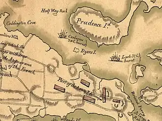 French Admiral d'Estaing's squadron arrived in Narragansett Bay on 29 July 1778 to support the American army under General George Washington during the battle of Rhode Island. On 30 July, four French ships of the line entered Narrangansett Bay and positioned themselves north of Conanicut Island to support the American and French forces in the battle of Rhode Island.[6] The arrival of the French vessels trapped several British vessels, Lark among them. On 5 August 1778, as Lark lay off Newport, Captain Richard Smith had her set on fire and her cables cut. She then drifted on to shore.[7] The Royal Navy ended up having to destroy ten of their own vessels in all.[7]