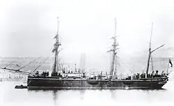 The last of six 8-gun Mariner-class gunvessels designed by Nathaniel Barnaby,[1] the Royal Navy Director of Naval Construction, her hull was of composite construction; that is, iron keel, frames, stem and stern posts with wooden planking. She was fitted with a 2-cylinder horizontal compound expansion steam engine driving a single screw, which was also built in the Malta Dockyard.[1] She was rigged with three masts, with square rig on the fore- and main-masts, making her a barque-rigged vessel. Her keel was laid at a special slipway built for her on the Senglea side of French Creek, which was still known as the "Melita Slip" into modern times.[2] Although laid down on 18 July 1883,[1] work progressed slowly; the entire enterprise had been designed to employ the local workforce when the Mediterranean Fleet was absent, and the fleet's frequent presence caused work on the new vessel to be halted all too often.[2] She was launched as Melita, the Latin name for the Malta, on 20 March 1888 by Princess Victoria Melita, the twelve-year-old daughter of the Duke of Edinburgh who was Commander-in-Chief of the British Mediterranean Fleet.[2] The Army and Navy Gazette reported that
