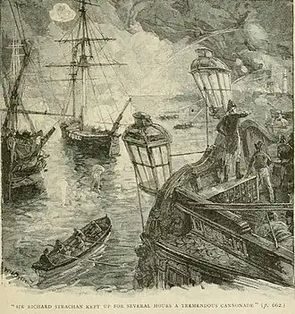 ![]() Sir Richard Strachan on HMS San Domingo, conducting the bombardment of Flushing during the Walcheren Campaign of 1809[1]