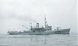 After the German capture of Horten the surrendered Norwegian vessels were pressed into Kriegsmarine service. Rauma was repaired and recommissioned as Kamerun on 18 April 1940.[3] Kamerun first served as a Vorpostenboot in the Hafenschutzflotille Oslo, later being converted into a minelayer.[4] Kamerun spent her entire war in Norway and was part of the German Mine Sweeping Administration (GM-SA) after the German surrender in 1945.[1]