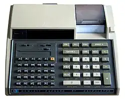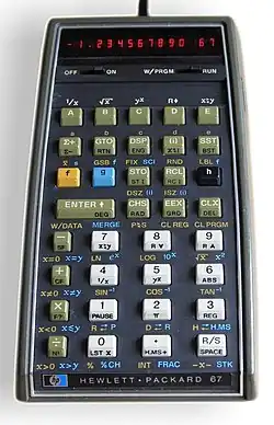 The HP-67 is a magnetic card-programmable handheld calculator, introduced by Hewlett-Packard in 1976 at an MSRP of $450.[1] A desktop version with built-in thermal printer was sold as the HP-97 at a price of $750.[2] Collectively, they are known as the HP-67/97.[3]