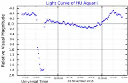 HU Aquarii (abbreviated HU Aqr) is an eclipsing binary system approximately 620 light-years away from the Sun,[2] forming a cataclysmic variable of AM Herculis-type. The two stars orbit each other every 2.08 hours[3] and the ultra-short binary system includes an eclipsing white dwarf and red dwarf.