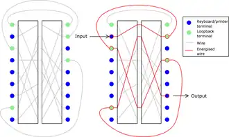 ![]() A diagram of a loopback-rotor construction; in this simplified example, two rotors with nine contacts each are used. There are six inputs and outputs, leaving three loop-back wires. | |