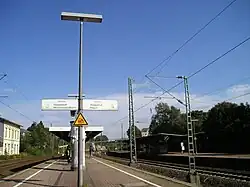 The railway station on the Düsseldorf-Elberfeld line was opened on 3 September 1841 under the name of Haan (Gruiten) and for many years it was the only Haan station. The line to Cologne was opened in 1867 and the current Haan station was opened in 1907, allowing the station in the then independent town of Gruiten to be renamed Gruiten station. In 1909 the existing station building was built. As part of the establishment of S-Bahn services on the Düsseldorf–Wuppertal line in 1988, Gruiten station was significantly rebuilt. The platform on track 1 and the ramps for loading limestone were demolished. This allowed a large park and ride lot to be built. Tracks 2 and 3 were moved and now serve as the S-Bahn station.[6] Track 4 is used as a platform for overtaking trains on the route to and from Cologne. The normal platform for trains to and from Cologne is served by tracks 5 and 6. Track 7 is used by freight trains.