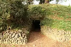 The tumulus is built in four tiers in the rectangular portion and three tiers for the circular portion. Unusually, the width of the rectangular portion is larger than the circular portion. The tumulus was at least partially surrounded by a moat. The 15.8 meter long horizontal burial chamber is made from stone megaliths, some measuring 4.5 x 3.4 meters, weighing over 50 tons, orientated to the southwest. The size of the megaliths used to make this chamber is also unusual, and the tomb is comparable to the Ishibutai Kofun in Asuka. The burial chamber was found to be intact when opened in March 1945 by locals who were building a bomb shelter and some 300 artifacts were discovered within. These grave goods included four bronze mirrors, gold, silver and glass jewelry, iron swords, iron spearheads, fragments of armor, horse harnesses, saddles, stirrups and Sue ware, Haji ware, and other containers of earthenware and metal. Two of the bronze mirrors were identical to those found in the Inariyama Kofun in Saitama Prefecture and must have been cast using the same mould. From these artifacts, the tumulus has been dated to the end of the 6th century to the beginning of the 7th century AD, and may have been one of the last of the great keyhole-shaped kofun to have been built in Gunma.[3]