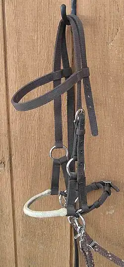 The bosal (/boʊˈsɑːl/, /boʊˈsæl/ or /ˈboʊsəl/; Spanish pronunciation: [boˈsal]) (bozal) is the noseband element of the classic jaquima or true hackamore. The bosal is seen primarily in western-style riding. It is derived from the Spanish tradition of the vaquero.[16] It consists of a fairly stiff rawhide noseband with reins attached to a large knot or "button" (Sp. bosal) at the base from which the design derives its name. The reins are made from a specially tied length of rope called a mecate (/məˈkɑːteɪ/ in this usage; Spanish pronunciation: [meˈkate]), which is tied in a specific manner to both adjust the size of the bosal, and to make a looped rein with an extra length of rope that can be used as a lead rope. In the Texas tradition, where the bosal sets low on the horse's face, and on very inexperienced ("green") horses in both the California (vaquero) and Texas traditions, a specialized rope throatlatch called a fiador /ˈfiːədɔːr/ is added, running over the poll to the bosal, attached to the hackamore by a browband.[25] The fiador keeps a heavy bosal properly balanced on the horse's head without rubbing or putting excess pressure on the nose. However, it also limits the action of the bosal, and thus is removed once the horse is comfortable under saddle.[26] The terms mecate and fiador have at times been Americanized as "McCarty" or "McCarthy" and "Theodore", but such usage is considered incorrect by hackamore reinsmen of the American West.[24]