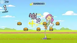 The player takes the role of one of three athletes, two of which are immediately available; Toby (who gains super faster), Corrine (has a larger super target),[3] or Ramirez, a werewolf with faster kicks which must be unlocked. The player must use a cat as a hacky sack, keeping it in the air, earning points and cheeseburgers in the process. Points are earned by tapping the cat to kick it and keeping it aloft, with extra points awarded for combos or style. Cheeseburgers occasionally appear on-screen and are earned by kicking cats over them to collect them, and are used to unlock rewards. Cheeseburgers can be used to unlock cosmetics such as cats with alternate appearances, as well as permanent powerups.[3] New cats arrive from the top of the screen periodically as the game progresses, increasing difficulty. If a cat hits the ground, or the player taps on an explosive bird, the game ends.[3] By earning points, the player builds 'superkick' charge, and a target appears in the center of the screen upon the supercharge bar being filled. By hitting the target when cats are in the middle, they are kicked offscreen and are cleared from the game.[4]