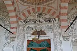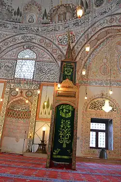 The Hadum Mosque features a mihrab facing the entrance. Mihrab is positioned in the center of the south-eastern wall, towards Mecca. This element is nicked into the wall forming a niche which ends in the upper part in form of the semi-cone. On the right side of mihrab is a mimber, which is used for preaching. Mimber, which serves for preaching, consists of : the door, the stairs and balldahin and it is entirely made of wood. The tectonic of this element is presented through paintings and carvings.[1][2][3][4]