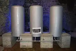 The radium-beryllium neutron source could be introduced into the center of the reactor through a so-called chimney. During the following experiment, the heavy water, which was stored in three large tanks at the end of the tunnel, was also filled into the inner reactor vessel through the chimney. There were also channels in the lid through which neutron detectors were inserted. This made it possible to measure the spatial neutron distribution in the entire arrangement by utilizing the cylindrical symmetry. The construction work on the reactor was completed in the first week of March 1945.[17]