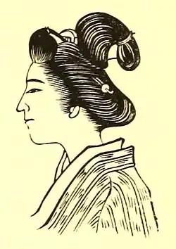 This hairstyle first appeared during the Edo period. Women began putting wax in their hair and pulling back a number of different buns and decorated it by adding combs, sticks, sometimes even flower and ribbons. This version is relatively simple compared to what would come in later years of this style. This was the main style of a Geisha.
