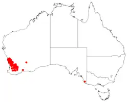 This species grows from Eneabba through the central wheatbelt region of Western Australia south to Dumbleyung on sand, loam, clay and lateritic gravel in heath and scrubland. This species grows best in full sun where drainage is good. It is frost tolerant and moderately drought resistant. A good bird habitat due to its dense and prickly growth.[2][3]