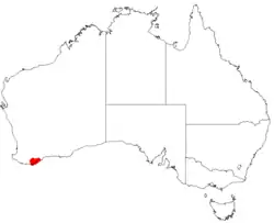 Long styled hakea is endemic to an area along the south coast in the Great Southern region of Western Australia between Albany, Jerramungup and Mount Barker where it is found on hilltops and in valleys growing in sandy-loamy, clay and gravelly soils.[4]
