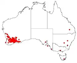 Grass-leaved hakea grows from Dalwallinu and south to Ravensthorpe and east to the Shire of Yilgarn in scrubland or low woodland on laterite ridges or sandy to gravelly loams. An ornamental species and spectacular in bloom, attracting nectar-loving birds.[9]