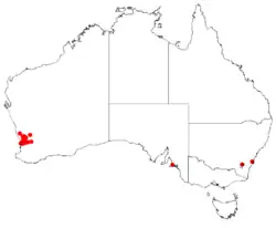 A restricted species growing near Perth with intermittent occurrences north to Victoria Plains, it grows in lateritic sandy clay, granite outcrops and wandoo woodlands. It is an ornamental garden plant good for rockeries and as a ground cover in a well-drained, open, sunny site.[3][6]