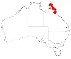 Hakea persiehana grows on Cape York Peninsula a large peninsula in far North Queensland as far south as the Atherton. Occurs in open woodland usually with Eucalyptus and Melaleuca.[2]