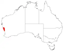 This species is endemic to a small area on the west coast, Mid West and the Wheatbelt regions of Western Australia between Geraldton and Dandaragan. It grows in sandy soils, loam and gravel in scrubland and heath.[2][3][4]