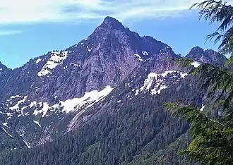 Hall Peak is a 5,484-foot (1,672-metre) mountain summit located in the South Fork Stillaguamish River Valley near the western edge of the North Cascades, in Snohomish County of Washington state.[3] It is located 5 miles (8.0 km) northwest of Barlow Pass along the Mountain Loop Highway, near the Monte Cristo area, on land administered by the Mount Baker-Snoqualmie National Forest. Its nearest higher peak is Big Four Mountain, one mile to the south-southwest. Both mountains can be prominently seen from the Big Four picnic area, where the trail to the Big Four Ice Caves starts. The peak is named for mining prospector George Hall, who in 1891, discovered the Forty Five claim.[4][5]