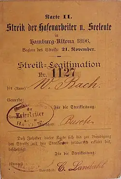 - ^ a b Legien, Carl (1897). Der Streik der Hafenarbeiter und Seeleute in Hamburg-Altona. Darstellung der Ursachen und des Verlaufs des Streiks, sowie der Arbeits- und Lohnverhältnisse der im Hafenverkehr beschäftigten Arbeiter [The strike by dockworkers and seafarers in Hamburg-Altona. Description of the causes and course of the strike, as well as the working and wage conditions of workers employed in port transport.] (in German). Hamburg: Verlag der Generalkommission der Gewerkschaften Deutschlands.
