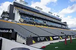 On August 31, 2011, the Tiger-Cats announced plans to close Ivor Wynne Stadium at the end of the 2012 season and begin play in the long planned Pan American Stadium in 2014.[28] Throughout the 2013 season, they played their home games at Guelph University's stadium because the new stadium was still under construction. On November 24, 2013, the Hamilton Tiger-Cats lost to the Saskatchewan Roughriders 45–23 in the 101st Grey Cup at Mosaic Stadium at Taylor Field. The game had star appeal as actor Tom Hanks attended with comedian Martin Short, a Hamilton native. Early in the third quarter, Hanks was shown replacing a Ti-cats toque with a Riders hat, drawing a loud roar from the crowd.[29] After construction of the new stadium fell behind schedule in 2014, the team moved the first few games of its 2014 season to Ron Joyce Stadium.