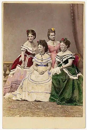 In an attempt to create more realistic images, photographers and artists would hand-colour monochrome photographs. The first hand-coloured daguerreotypes are attributed to Swiss painter and printmaker Johann Baptist Isenring, who used a mixture of gum arabic and pigments to colour daguerreotypes soon after their invention in 1839.[2] Coloured powder was fixed on the delicate surface of the daguerreotype by the application of heat. Variations of this technique were patented in England by Richard Beard in 1842 and in France by Étienne Lecchi in 1842 and Léotard de Leuze in 1845. Later, hand-colouring was used with successive photographic innovations, from albumen and gelatine silver prints to lantern slides[3] and transparency photography.