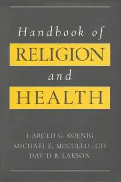 Handbook of Religion and Health is a scholarly book about the relation of spirituality and religion with physical and mental health. Written by Harold G. Koenig, Michael E. McCullough, and David B. Larson, the first edition was published in the United States in 2001. Subsequent editions in 2012 and 2023 provide entirely new content as each edition reviews researched published since the previous edition. The book has been discussed in magazines[1][2][3] and reviewed in professional journals.[4][5][6][7][8][9][10][11][12]