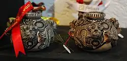 Lacquerware, going by the names of laca or maque, is a craft tradition which survives from the pre Hispanic period. While it was a common craft in the Mesoamerican period, today the only center for its production in the state is Chiapa de Corzo. The lacquerware is coated and decorated using fine brushes, but the products tend to be limited to gourds, bowls and “toles.” In the past a wider variety of objects were lacquered such as religious items and furniture. The craft declined and almost disappeared but today it is supported by state and federal government entities that train artisans and help them sell their wares.[8] The state also supports a lacquer museum, which was founded in 1952 by anthropologist Alfonso Caso to demonstrate the pre Hispanic origins of the craft, its techniques and materials.[2]